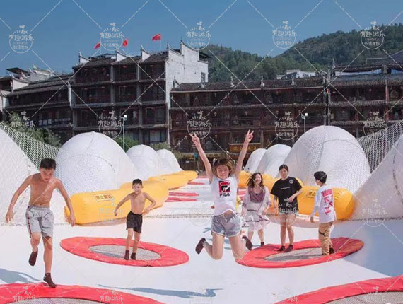 水上魔毯特征:水上魔毯項目建設在寬闊的水面上,采用充氣軟床、蹦床、繩網(wǎng)等柔性材料搭建一座有趣的軟橋。水上魔毯項目可以讓游客在橋面上彈跳、奔跑、翻滾等作出自由的動作。水上魔毯是景區(qū)、營地中新型的游樂項目